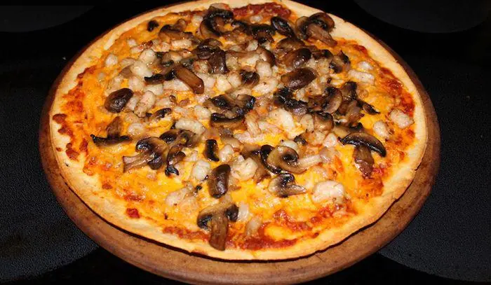 Pomodoro san marzano, mozzarella fior di latte, Gamberetti scottati, funghi Porcini insaporiti con aglio e filo d'olio Evo al limone